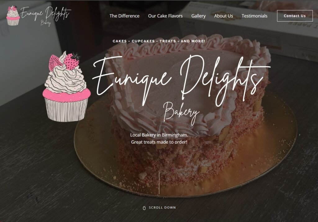 We crafted a deliciously inviting website for Eunique Delights Bakery, a Birmingham-based custom cake shop. The design highlights their handcrafted artistry with a warm, elegant aesthetic, featuring a robust menu display, a heartfelt “Meet the Baker” section, and glowing customer testimonials. The site is built for conversions, making it simple for customers to browse flavors, connect with the baker’s story, and place their orders with ease.